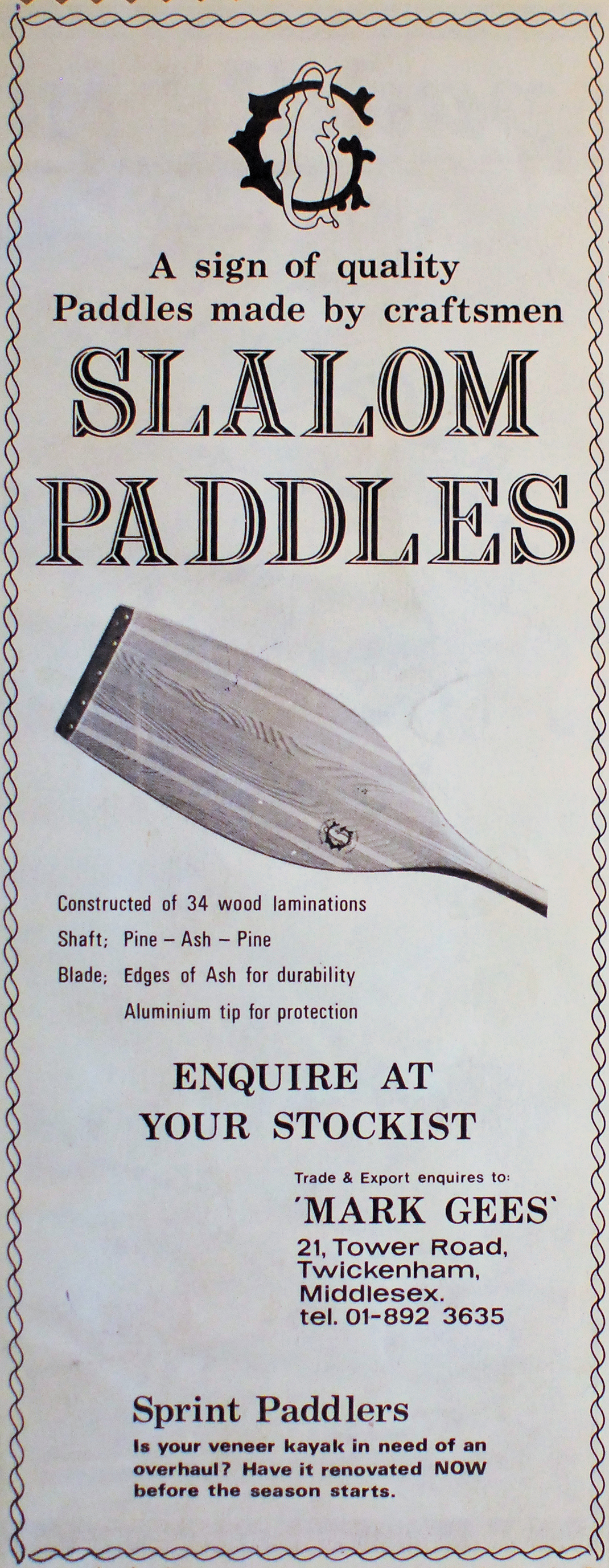 In 1969 Mike Clark of Canoeing Magazine suggested I make kayak slalom paddles and within two years I had a range of paddles. Models such as Ace, Triton, Champion and Leda all slalom blades and Regal, Ardor and Impact for kayak racing. My business expanded and over the next few years we made thousands of Gees paddles, and exported them all over the world, with distributors in: Australia, USA, Canada, Denmark, Norway, Holland and Belgium.